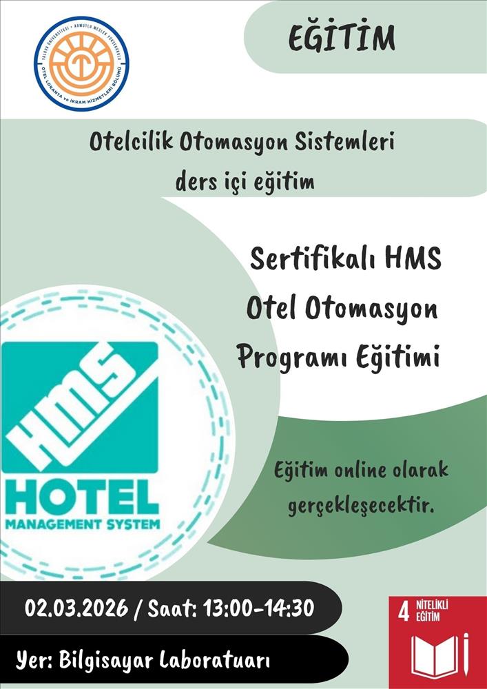 Otelcilik Otomasyon Sistemleri Ders İçi Eğitim kapsamında HMS Otel Otomasyon Programı Sertifikalı eğitimi 02.03.2026 tarihinde saat 13:00- 14:30 arasında Bilgisayar Laboratuvarında gerçekleştirilecektir. Öğrencilerimizi bekliyoruz.