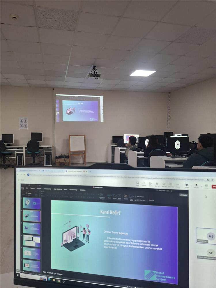 Otel, Lokanta ve İkram Hizmetleri Bölümü Turizm ve Otel İşletmeciliği Programı 1. sınıf öğrencilerinin katılımıyla düzenlenen eğitim, öğrencilerin sektörde yaygın olarak kullanılan otel otomasyon sistemlerini tanımalarını ve uygulamalı olarak öğrenmelerini amaçladı. Eğitim programı kapsamında katılımcılara; rezervasyon işlemleri, oda yönetimi, müşteri kayıtları, raporlama süreçleri ve otel yönetiminde kullanılan dijital sistemlerin işleyişi hakkında kapsamlı bilgiler verildi. Uygulamalı olarak gerçekleştirilen eğitim sayesinde öğrenciler, teorik bilgilerini pratik uygulamalarla pekiştirme fırsatı buldu. Böylece turizm sektöründe önemli bir yere sahip olan otel otomasyon sistemlerinin işletme yönetimindeki rolü ve operasyonel süreçlere sağladığı katkılar daha yakından deneyimlendi. Online uygulamalı olarak gerçekleştirilen eğitim sayesinde öğrenciler, otel işletmelerinde kullanılan dijital sistemleri yakından tanıma fırsatı buldu. Program sonunda katılımcı öğrencilerin sertifika düzenlenmesi için bilgileri alınmış olup sertifikasyon süreci başlatılmıştır.